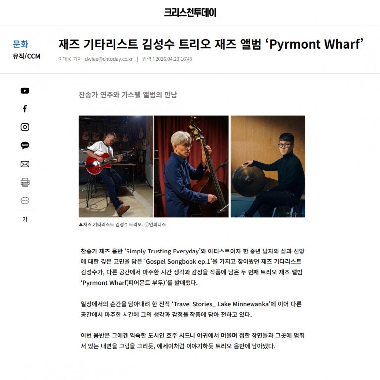 [기사] 재즈 기타리스트 김성수 트리오 재즈 앨범 ‘Pyrmont Wharf’(크리스천투데이)