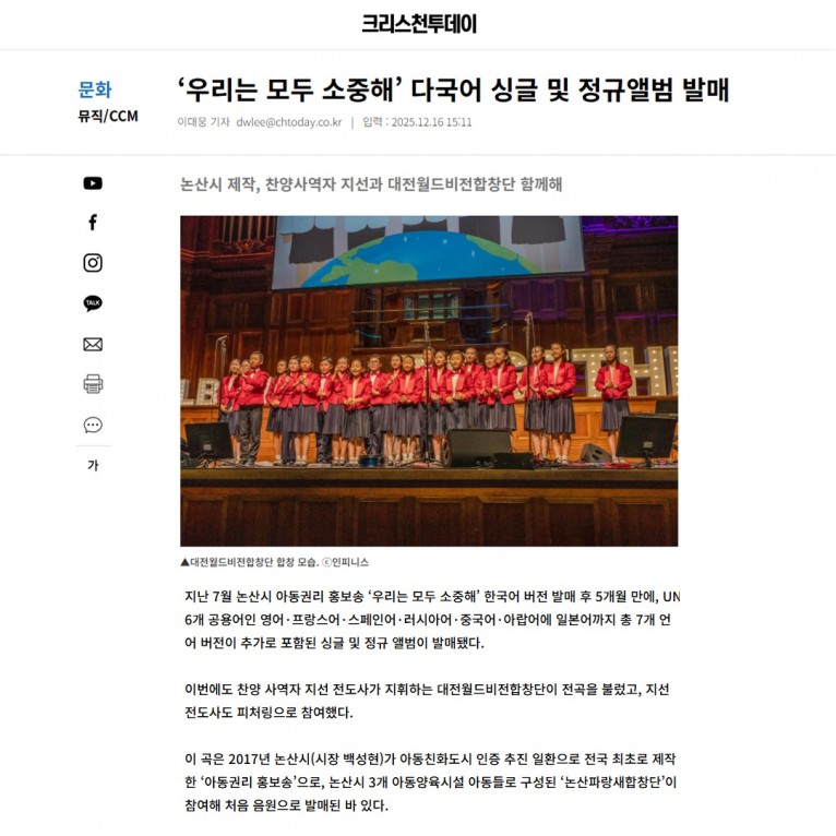 뮤직타임 [기사] ‘우리는 모두 소중해’ 다국어 싱글 및 정규앨범 발매(크리스천투데이)