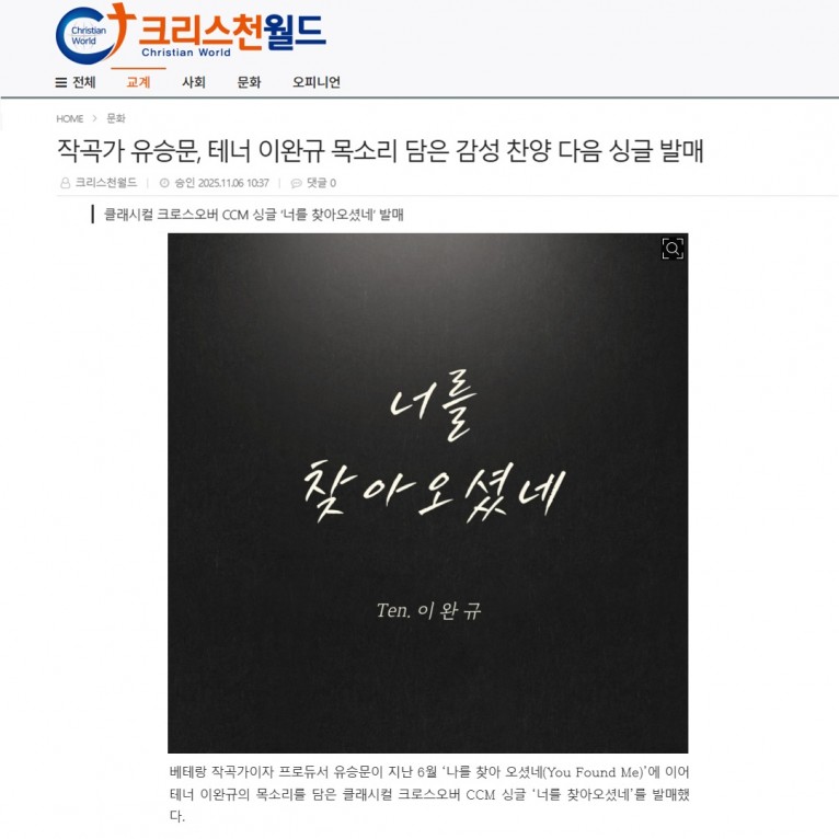베테랑 작곡가이자 프로듀서 유승문이 지난 6월 ‘나를 찾아 오셨네(You Found Me)’에 이어 테너 이완규의 목소리를 담은 클래시컬 크로스오버 CCM 싱글 ‘너를 찾아오셨네’를 발매했다.